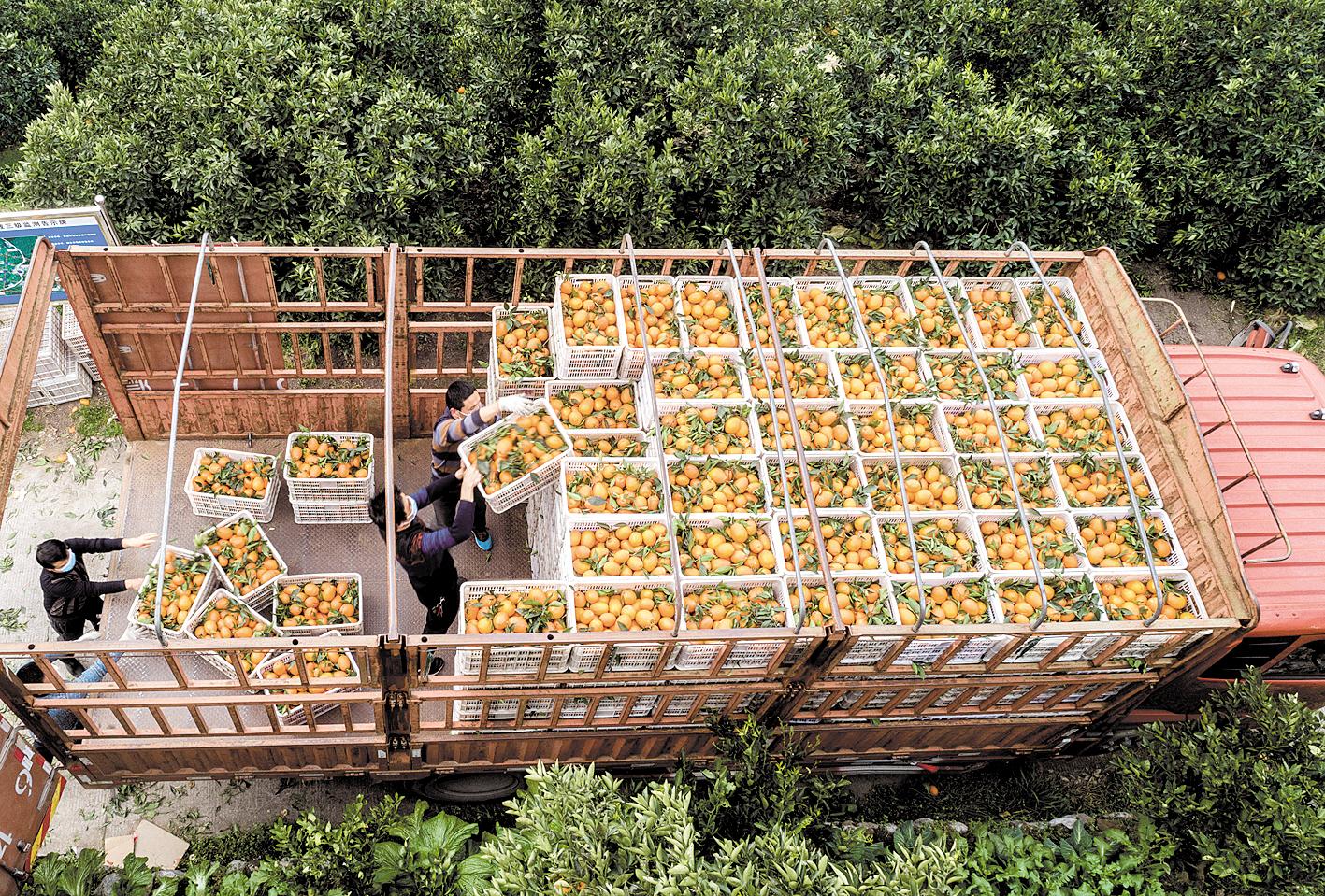 2月25日,秭归县郭家坝镇牛岭村村民戴着口罩在为脐橙装车。秭归县是三峡库区脐橙种植大县。由于疫情影响,全县尚有留树保鲜的纽荷尔脐橙和春季成熟上市的红肉脐橙5万多吨急需出售。该县在采取严格防疫措施的同时,组织村民采收,开通脐橙运输绿色通道。