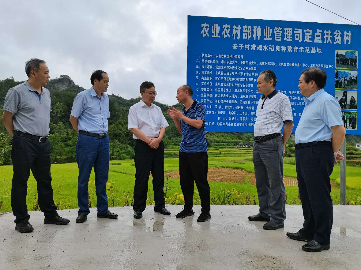 8月21-22日,农业农村部种业管理司一级巡视员周云龙来我省调研,厅二级巡视员董文忠陪同调研。调研组一行先后调研了来凤县三胡乡安子村水稻制种基地、藤茶种植基地、恩施州农科院良种繁育基地、脱毒马铃薯种薯繁育基地,详细了解了我省种业科技创新、体系管理、品牌建设及种业产业发展情况,并组织农业新型生产经营主体召开了座谈会。