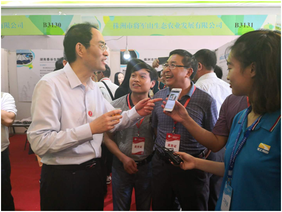 图1.中国绿色食品发展中心主任张华荣视察恩施展位,品尝利川红