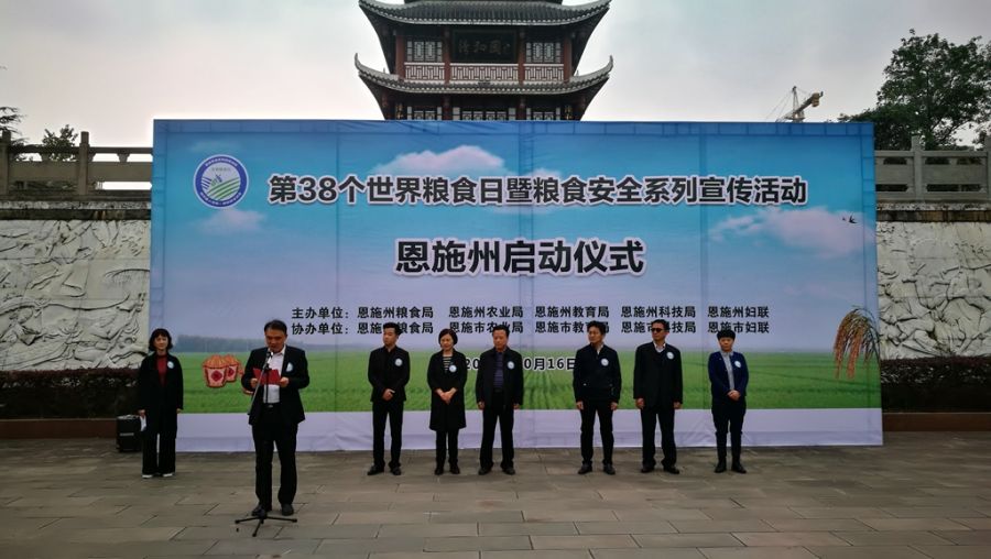 10月16日上午9时,第38个世界粮食日暨粮食安全系列宣传活动恩施州启动仪式在恩施州城风雨桥头广场举行。州长助理王刚出席会议并作重要讲话,州及恩施市农业系统、粮食系统、科技系统、教育系统及妇联等单位领导、专家参加了本次活动。